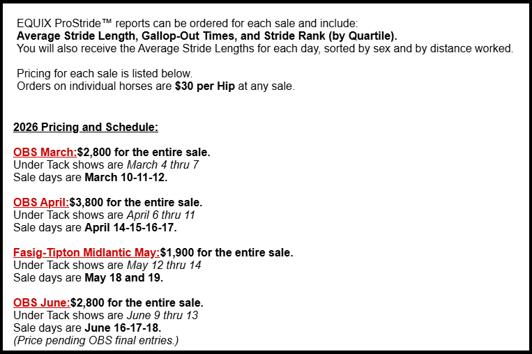 Please SIGN UP above to view our COMPLIMENTARY Under Tack Videos and to check out our Stride Data pricing for each Sale.
